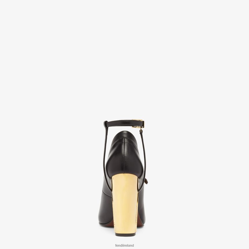 Round-toe Delfina pumps. Strap closure. Made of black leather. Heel with cut-out detail and gold-colored metal FF motif.