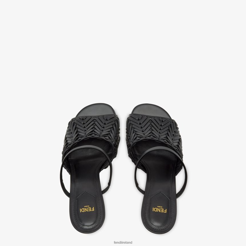 Fendi First sandals with wide band and strap. Made of black interlaced leather. Diagonal F-shaped sculpted heel in gold-colored metal.