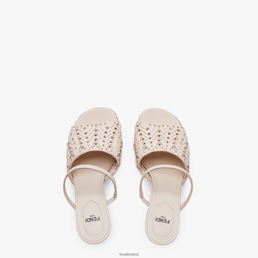 Fendi First sandals with wide band and strap. Made of pale pink interlaced leather. Diagonal F-shaped sculpted heel in gold-colored metal.