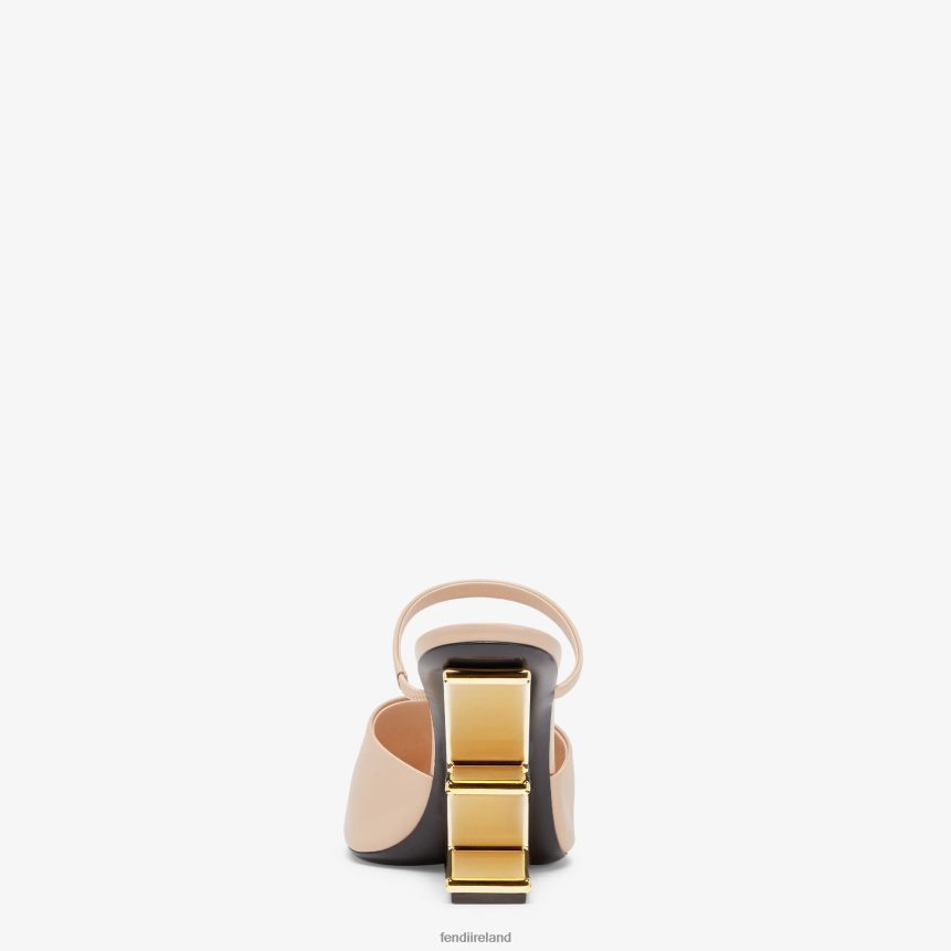 Fendi First sandals with wide band and strap. Made of pale pink leather. Diagonal F-shaped sculpted heel in gold-colored metal.