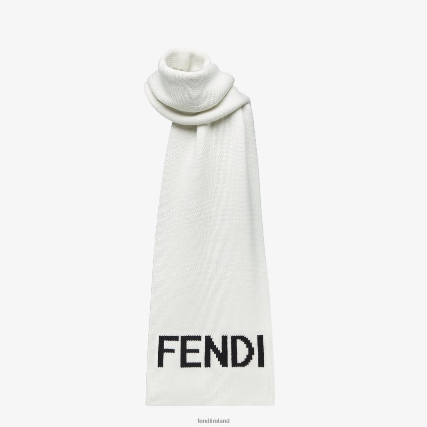 Rectangular scarf made of white wool. Decorated with jacquard Fendi lettering in black.