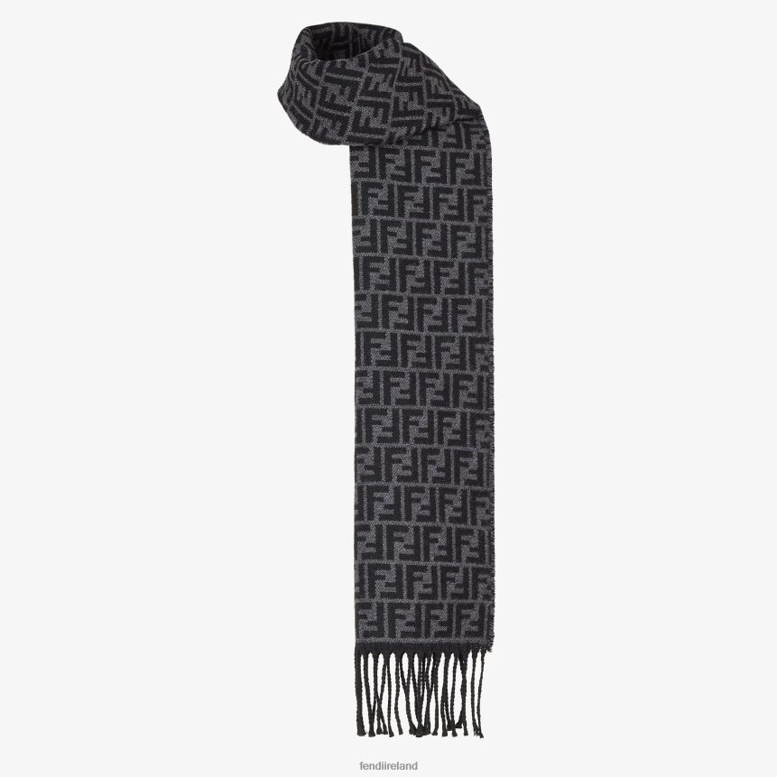 Rectangular scarf made of wool with gray and black printed FF motif. Embellished with fringes at the ends.