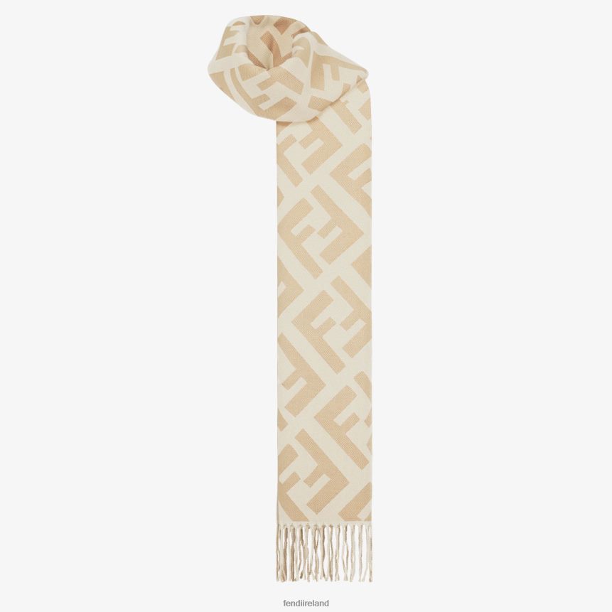 Long scarf finished with fringing. Made from beige cashmere. The jacquard is woven in an all-over FF motif.