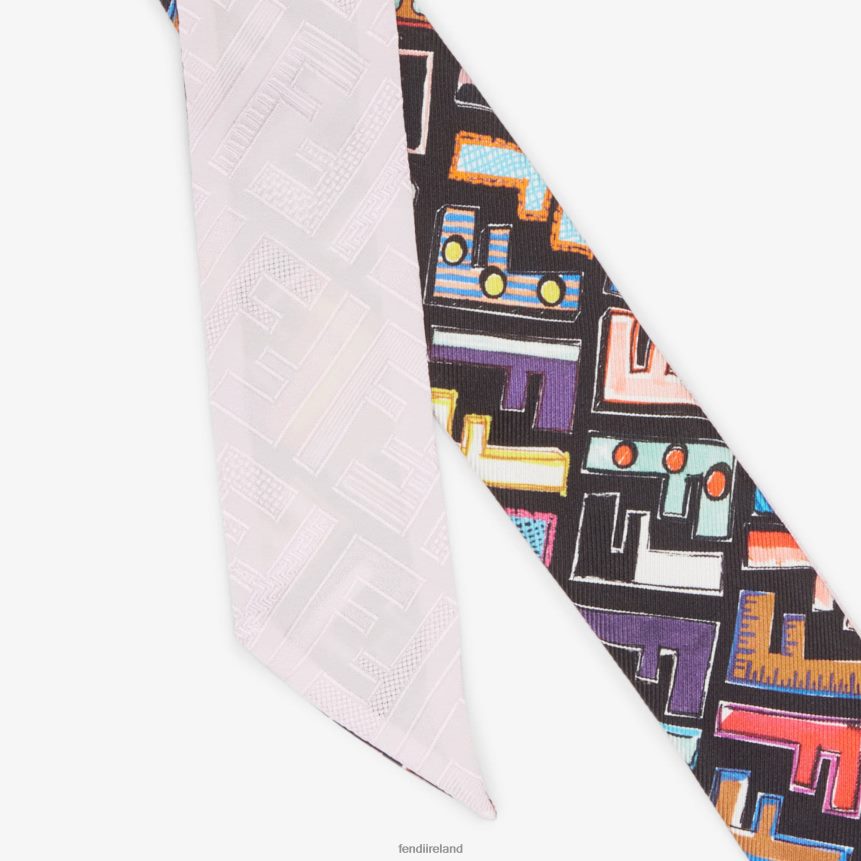 Double-sided wrappy. To wear around the neck, as a belt or tied at the wrist or to add a touch of colour to bags. Made of silk twill. One side is printed with the iconic FF logo, interpreted with multicolour hand-drawn patterns on a black background. The pink side is embellished with FF jacquard work.