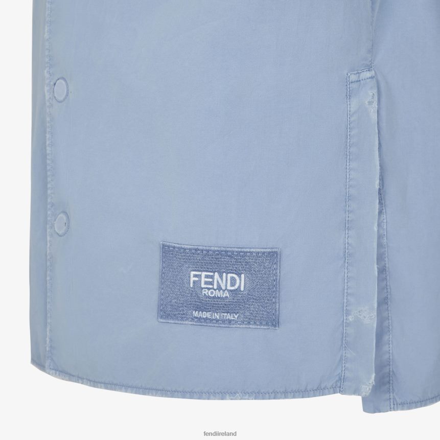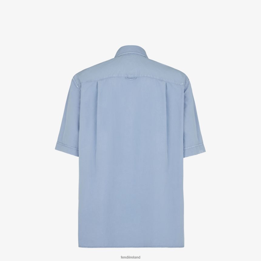 Short-sleeved shirt with patch pocket on the chest. Side slits in the hem and darts on the back. Covered press stud fastening. Made of dyed light blue cotton. Embellished with a matching-tone embroidered Fendi Roma label and worn-effect destroyed details.