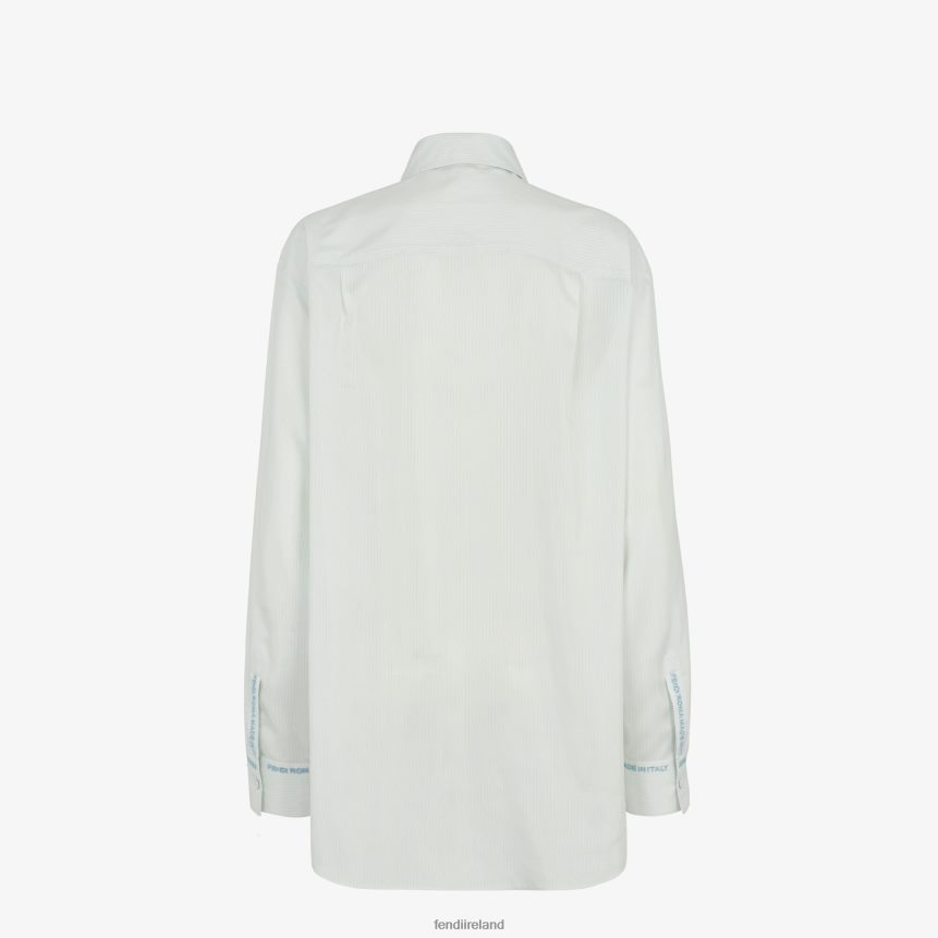 Long-sleeved shirt with dropped shoulders and breast pocket. Rounded hem. Covered button closure. Made of light blue striped silk. Embellished with the Fendi logo embroidered on the breast pocket and "FENDI ROMA MADE IN ITALY" lettering on the cuffs in the same color.