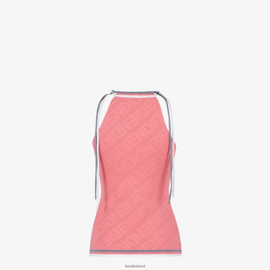 Sleeveless top with halter neck and ties to fasten on the shoulders. Made of a pink viscose knit, with all-over Fendi Mirror motif intarsia in the same colors. Trimmed with double piping on the edges in light blue and white.