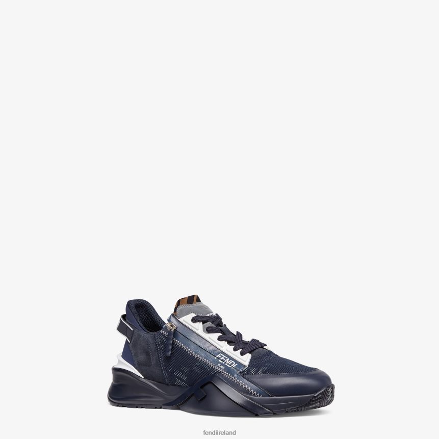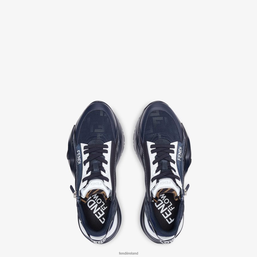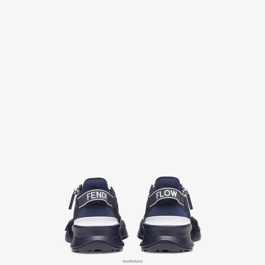 Slip-on sneakers with adjustable elastic laces, side zipper and corrugated sole with engraved F. Fendi Flow lettering embossed on the heels. Made of blue nylon with silver FF jacquard motif and blue leather details. Embellished with a LYCRA tongue with FF motif. 35 mm-1.38 inch black rubber running sole with tone on tone diagonal F detail.