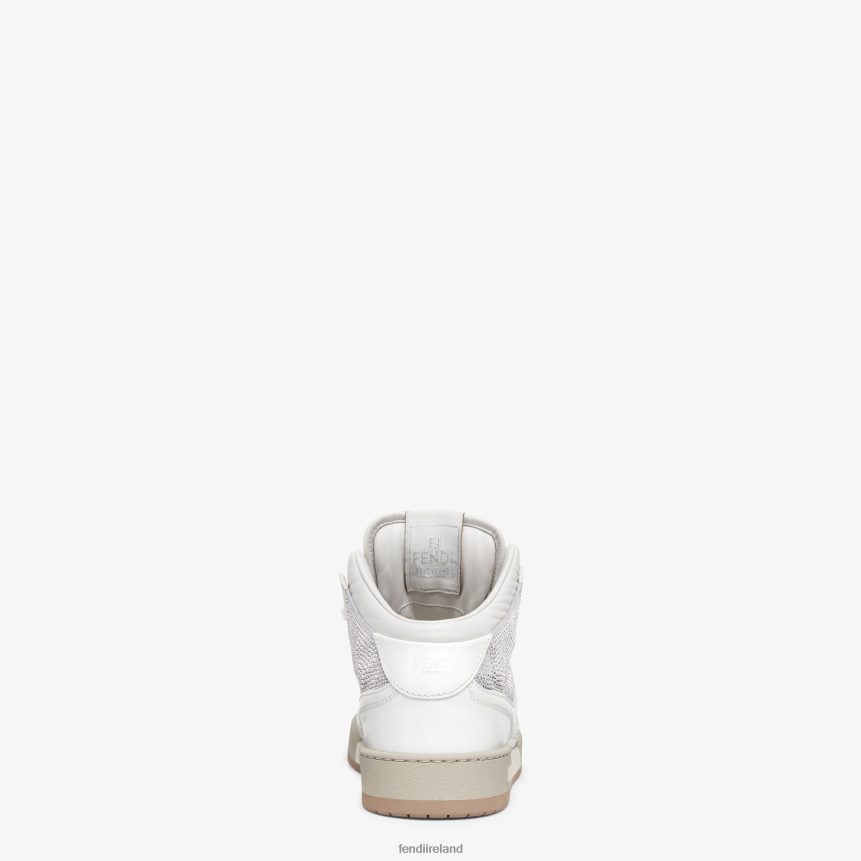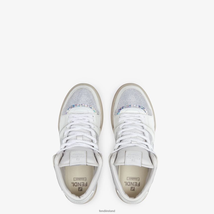 Fendi Match lace-up sneakers. Made of white leather embellished with rhinestones. Finished with embossed FF motif. Rubber sole with Fendi lettering on the side.