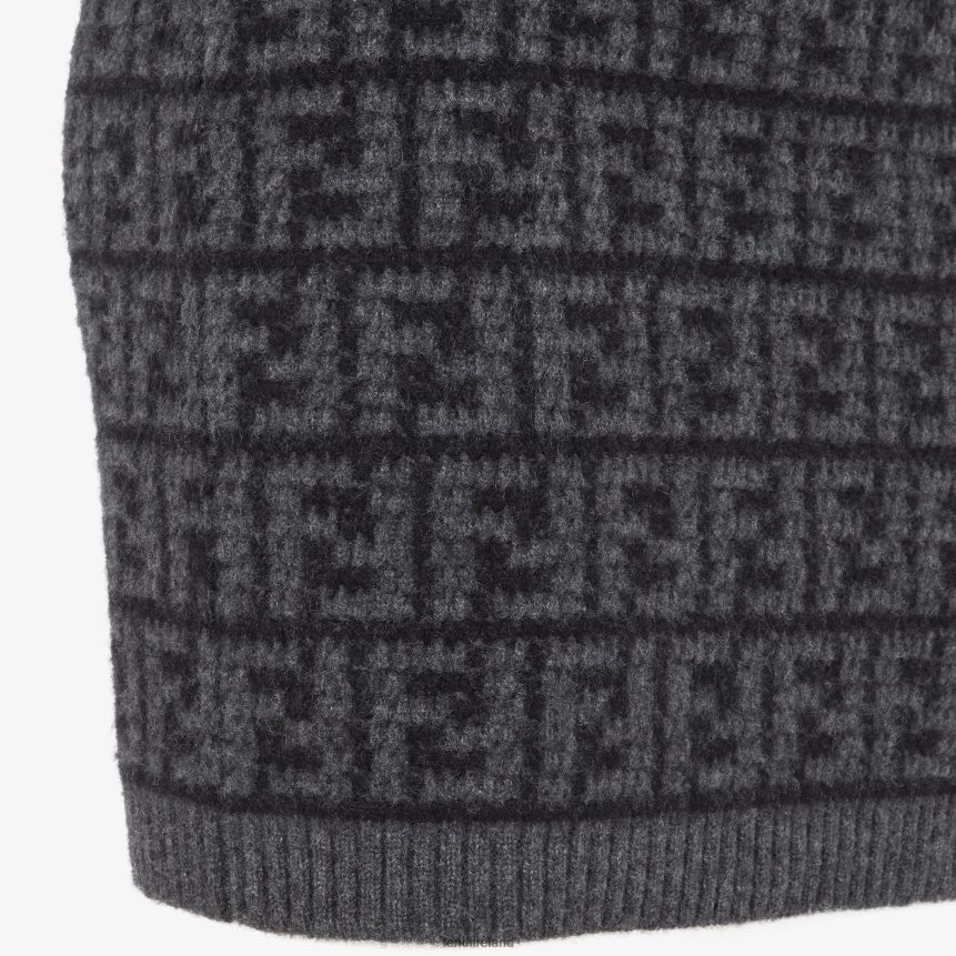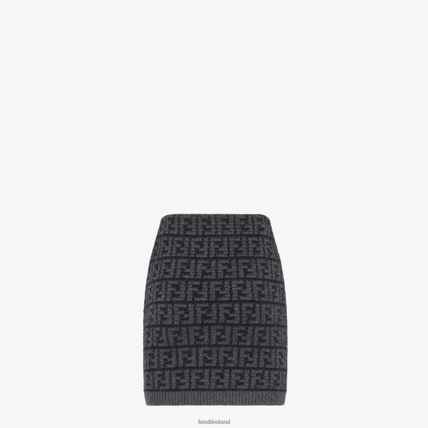 Short fitted skirt. Made of cashmere with all-over crocheted FF motif in gray and black. Trimmed with ribbed edge.