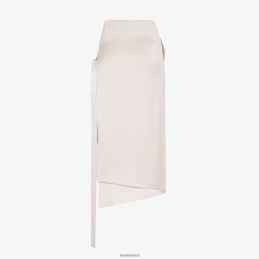 Straight-cut, A-line midi wrap skirt. Made of light beige silk satin. The front panel fastens on the side with leather ties and metal rings, creating a soft front draping with decorative oversized FF motif in white.