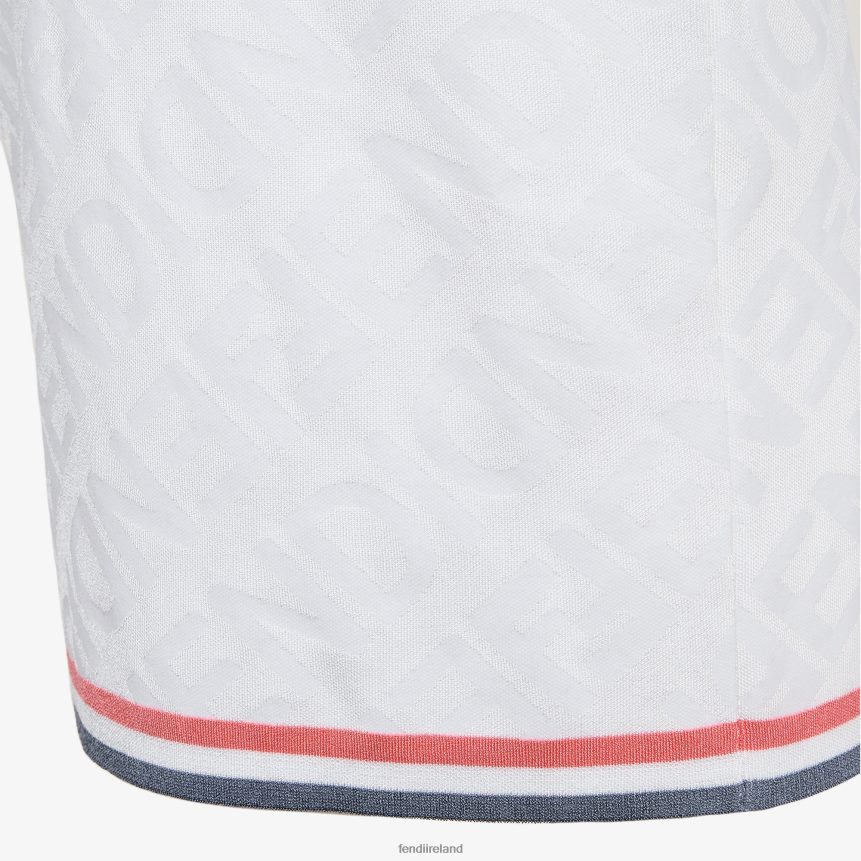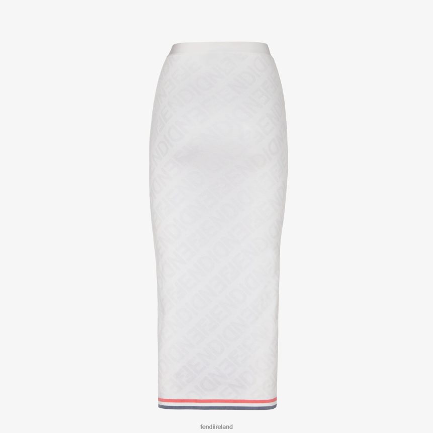 Midi pencil skirt. Made of a white viscose knit, with all-over Fendi Mirror lettering intarsia in the same color. Embellished with a double sporty stripe on the background in pink and light blue.