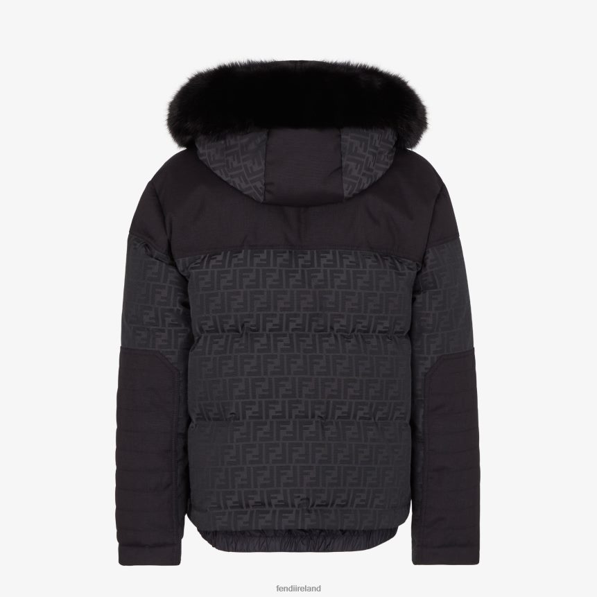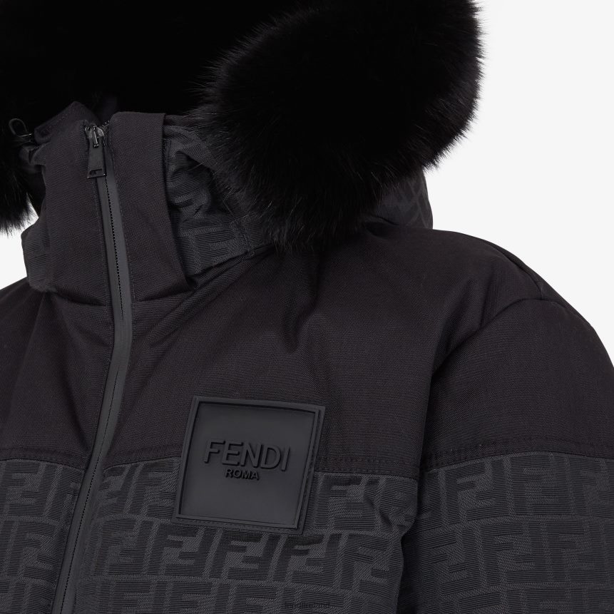 Ski jacket with a high collar and removable hood. Side pockets with zipper. The construction with a detachable windproof snow skirt guarantees high performance. Showerproof zipper closure. Made of black waterproof and windproof tech fabric. Decorated with jacquard FF motif and solid color inserts on the yoke, shoulders and front pockets. Finished with square FF patch in rubber and black fox fur hood trim.