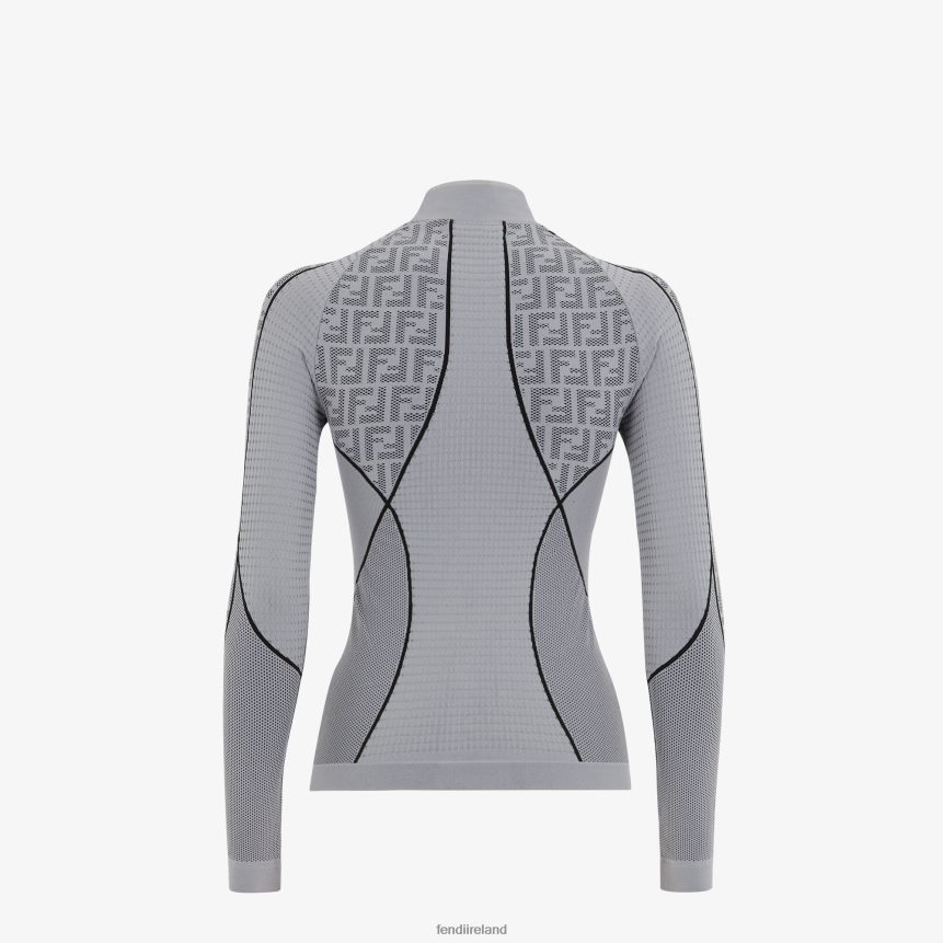 Figure-hugging seamless sweater with a high collar and long sleeves. Made of gray tech knit with tone on tone FF details. Finished with micromesh inserts and black edging.