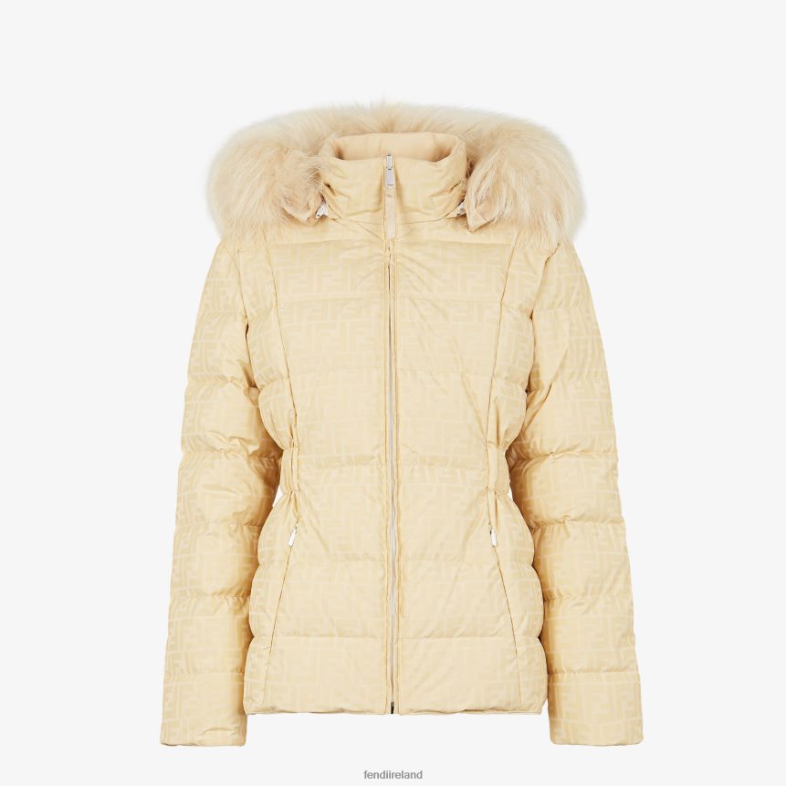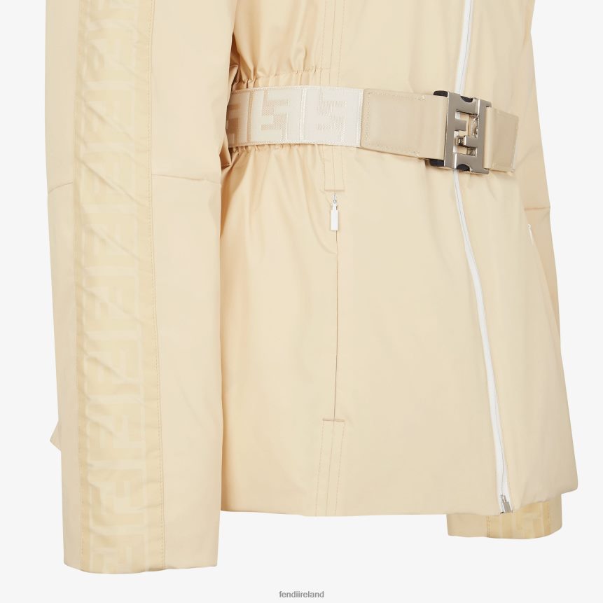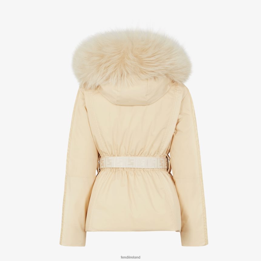 Reversible ski jacket with a high collar and removable hood trimmed with fox fur. Elasticized insert at the waist with matching belt. Side zipper pockets and a ski-pass holder pocket on the left sleeve. Zipper closure. Made of cream ECONYL regenerated nylon with padding. One side is in solid color with matching-tone printed FF band on the sleeves, other is customized with all-over FF printed motif. Stretch ribbon belt with jacquard FF motif and palladium-finish metal FF buckle. Regenerated duck down padding.