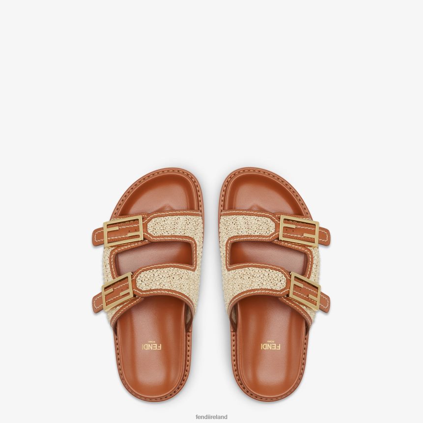 Double-band flat slides with FF Baguette decorative buckles. Made of brown leather. Pale yellow braided raffia details. Gold-finish metalware.