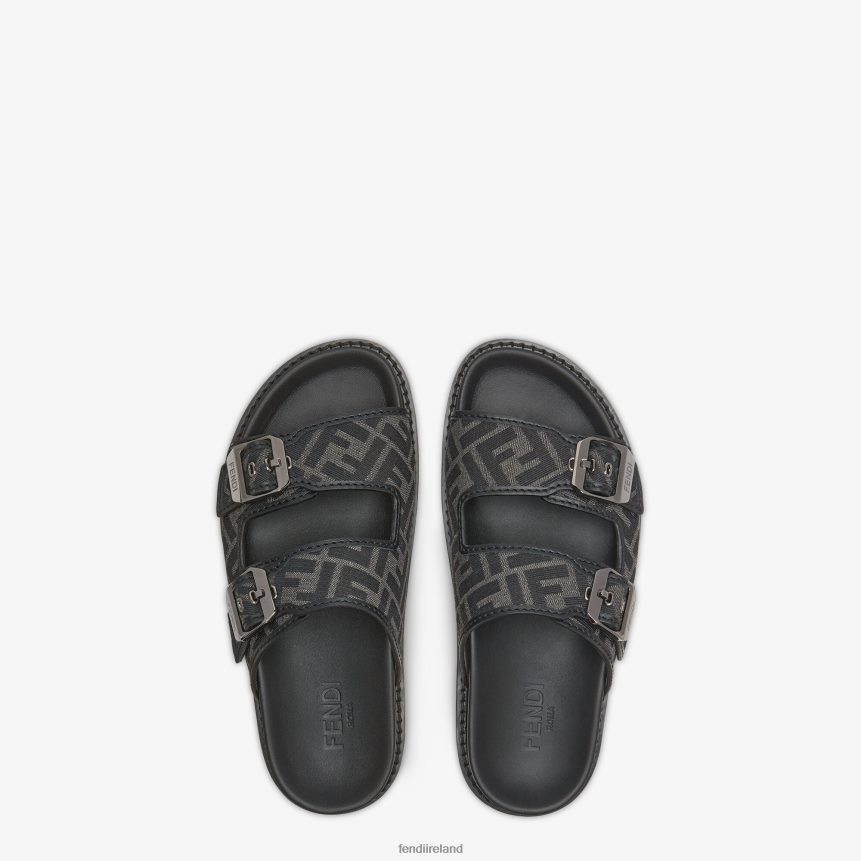 Sandals with wide, adjustable straps. Made of fabric with jacquard FF motif in black and gray. Black leather sole. Ultra-black ruthenium-finish metalware.