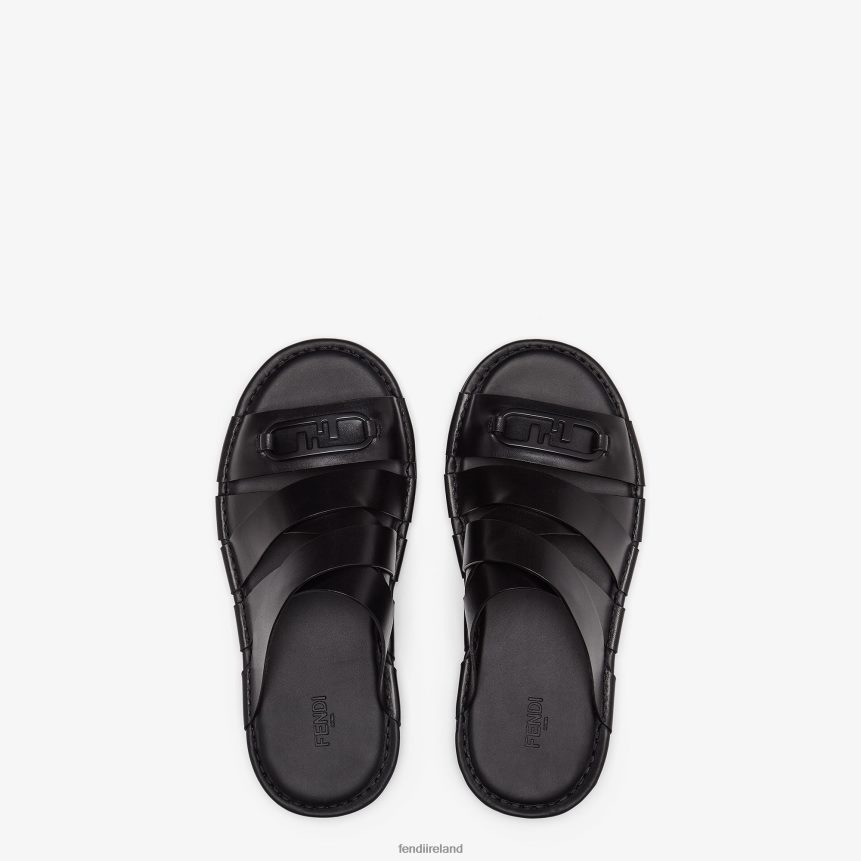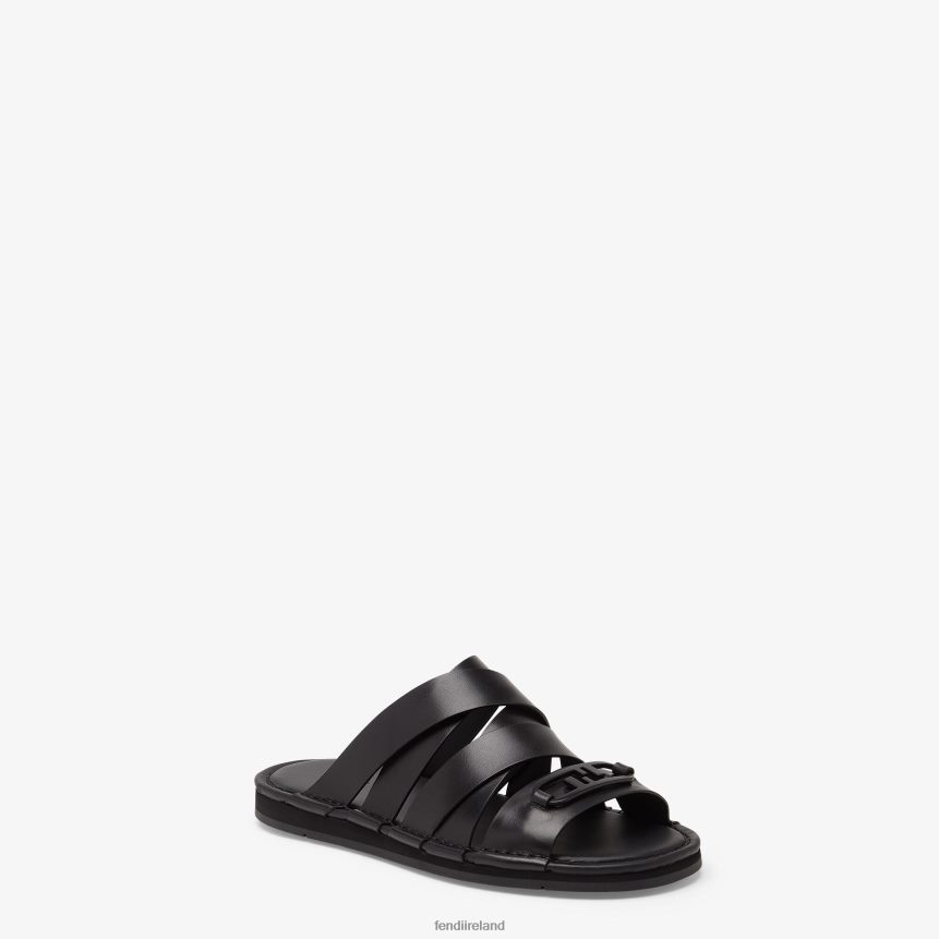Black leather slides with crossed bands. Embellished with the Fendi O'Lock motif in black enameled metal.