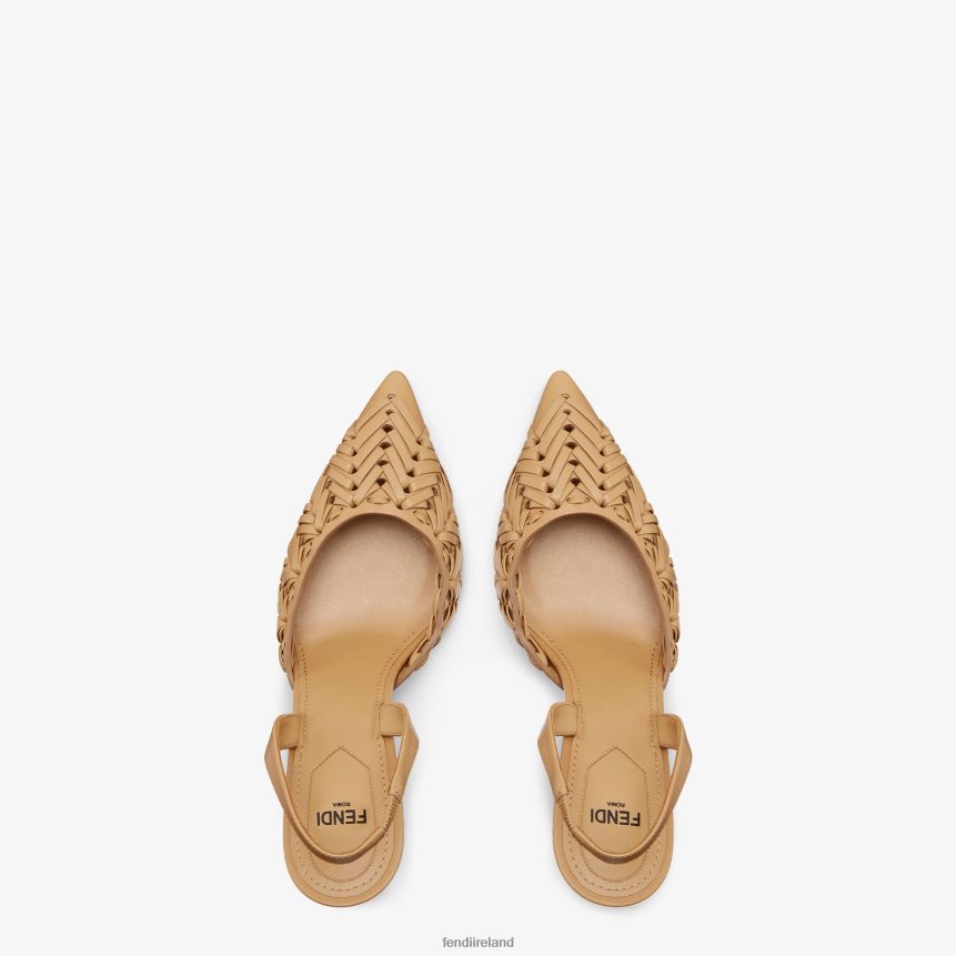Fendi First slingbacks with a tapered toe and ankle strap. Made of beige interlaced leather. Diagonal F-shaped sculpted heel in gold-colored metal.