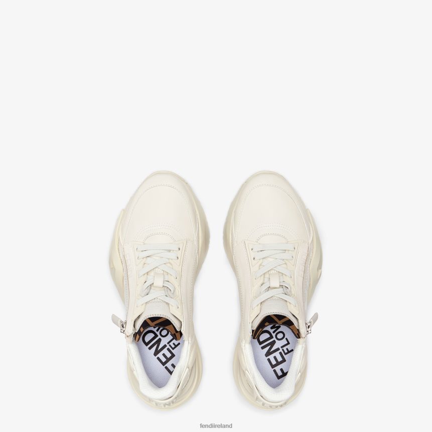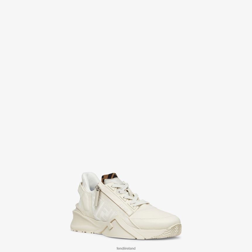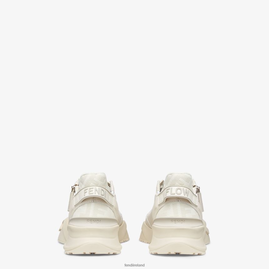 Fendi Flow sneakers with adjustable elastic laces and side zipper closure. Branded with FF pattern on the tongue and rubber tab with embossed logo on the back of the heel. Made of white leather. Fabric details with white and pale gray FF motif. 35 mm rubber running sole with tone on tone diagonal F detail.