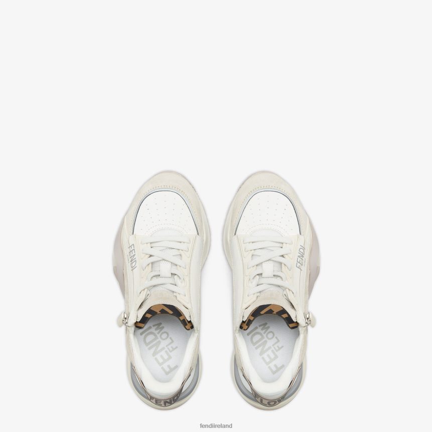 Slip-on sneakers with elastic laces, side zipper and corrugated sole with engraved F. Fendi Flow lettering embossed on the heels. Made of white suede with tech fabric inserts. Embellished with Lycra details with FF motif. Lightweight white rubber soles with pale pink diagonal F detail.
