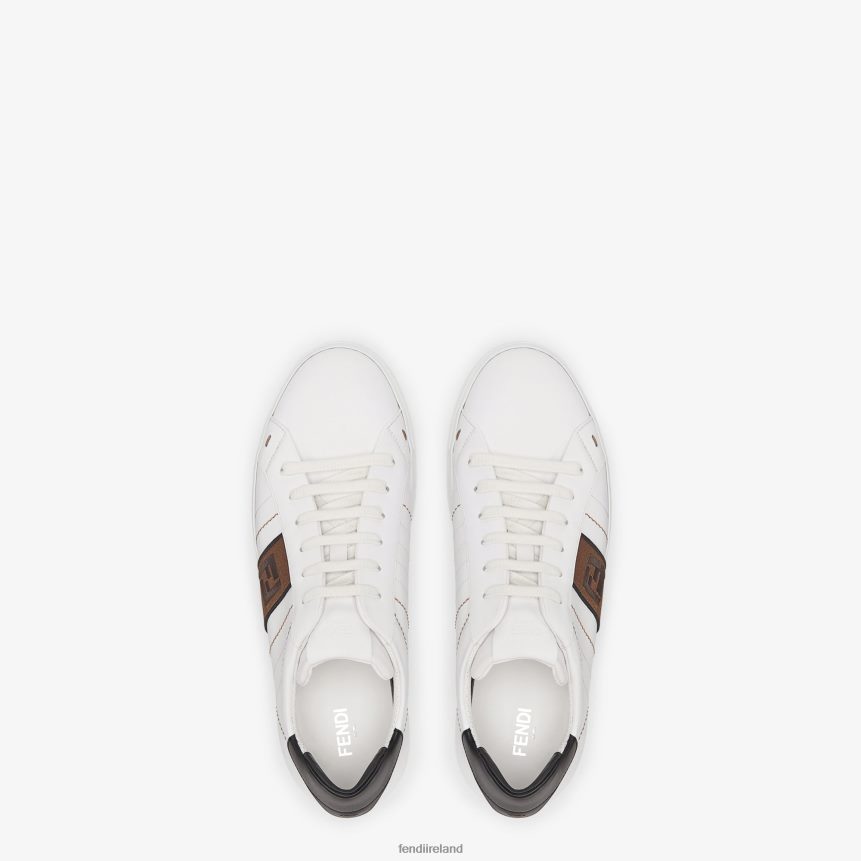 Lace-up sneakers. Rubber box sole. Made of white calfskin. Decorated with jacquard fabric ribbon with the FF motif embroidered in tones of brown. Heel covered in black leather.