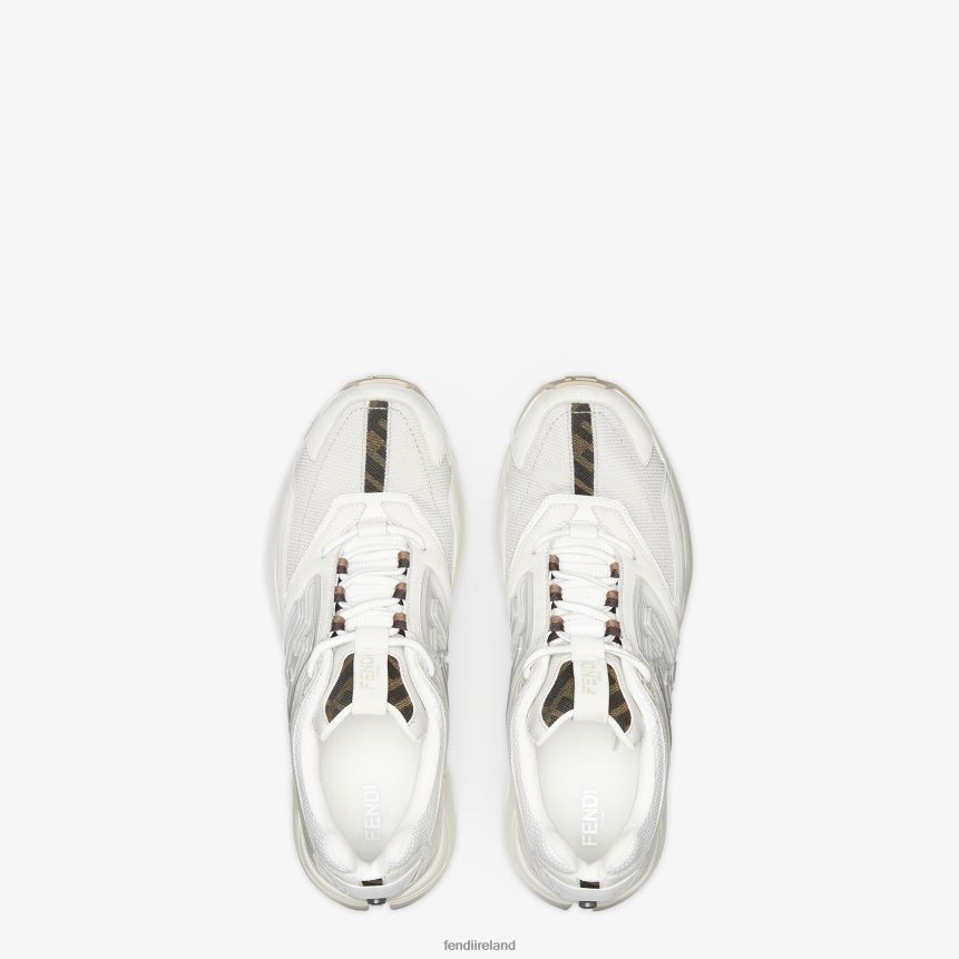 Fendi Faster sneakers made of white nubuck leather with matching leather and technical fabric details and embossed FF motif on the sides. Corrugated running soles with FF on the toes. Embellished with FF fabric inserts in brown and tobacco.