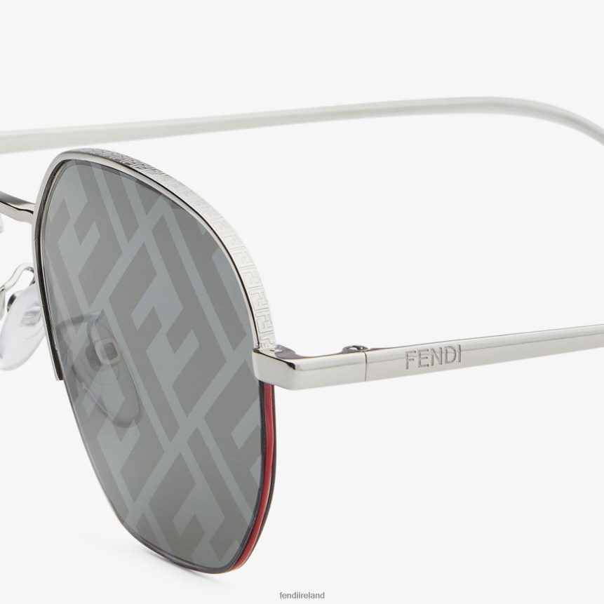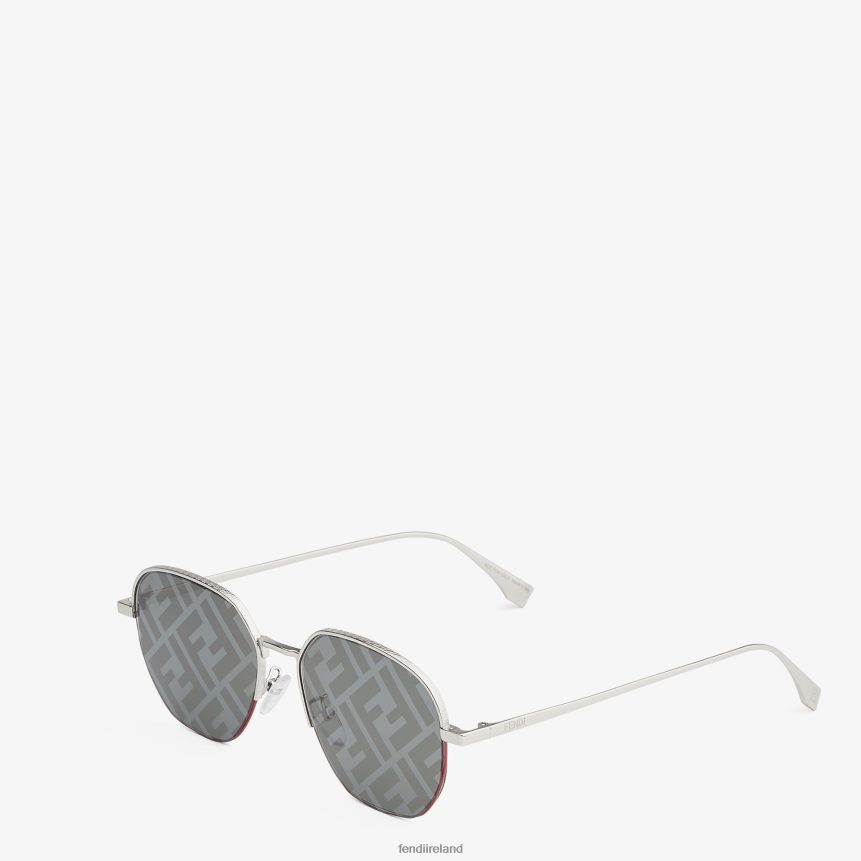 Round frames in palladium-finish metal. The front of the frame features an FF pattern engraved on the upper part and a red metal thread on the lower edge. Gray lenses with all-over silver mirror-effect FF logo. Adjustable nose pads branded with the Fendi logo.