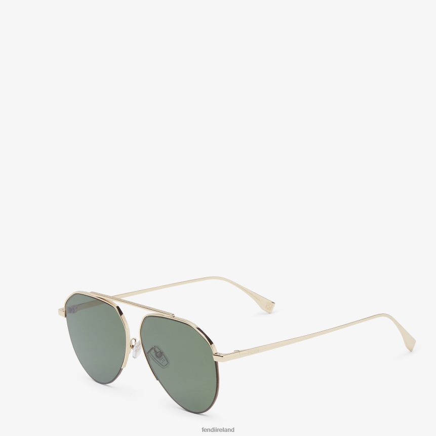 Pilot style sunglasses in gold-colored metal. The front features an FF pattern engraved on the upper part. Green lenses. Adjustable nose pads branded with the Fendi logo.