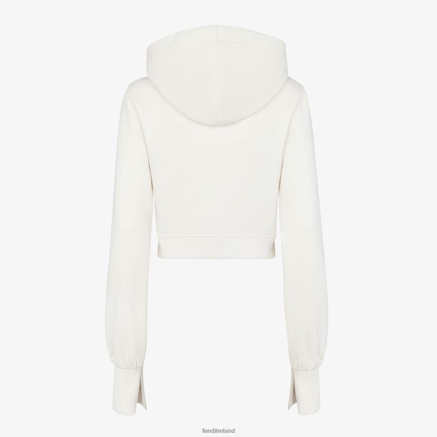 Cropped sweatshirt with drawstring hood. Ribbed cuffs and hem. Made of white cotton jersey. Embroidered FENDI lettering on the front embellished with matching color velvet.
