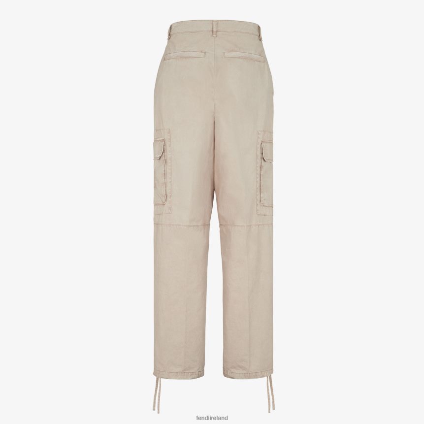 Straight-cut cargo trousers. Side pockets, patch pockets on the legs and welt pockets on the back. Drawstring detail at the ankle. Concealed zip fastening. Made of stretch cotton gabardine in beige. Worn-effect destroyed details. Embellished with embroidered jacquard Fendi label on the left cargo pocket.