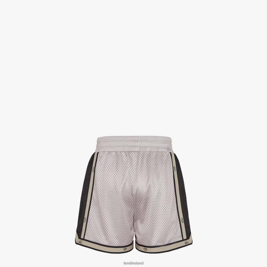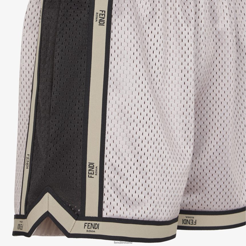 Bermudas with elasticated waist. Made of light gray tech mesh with black side band. Finished with sporty jacquard Fendi logo ribbons along the sides and hem.