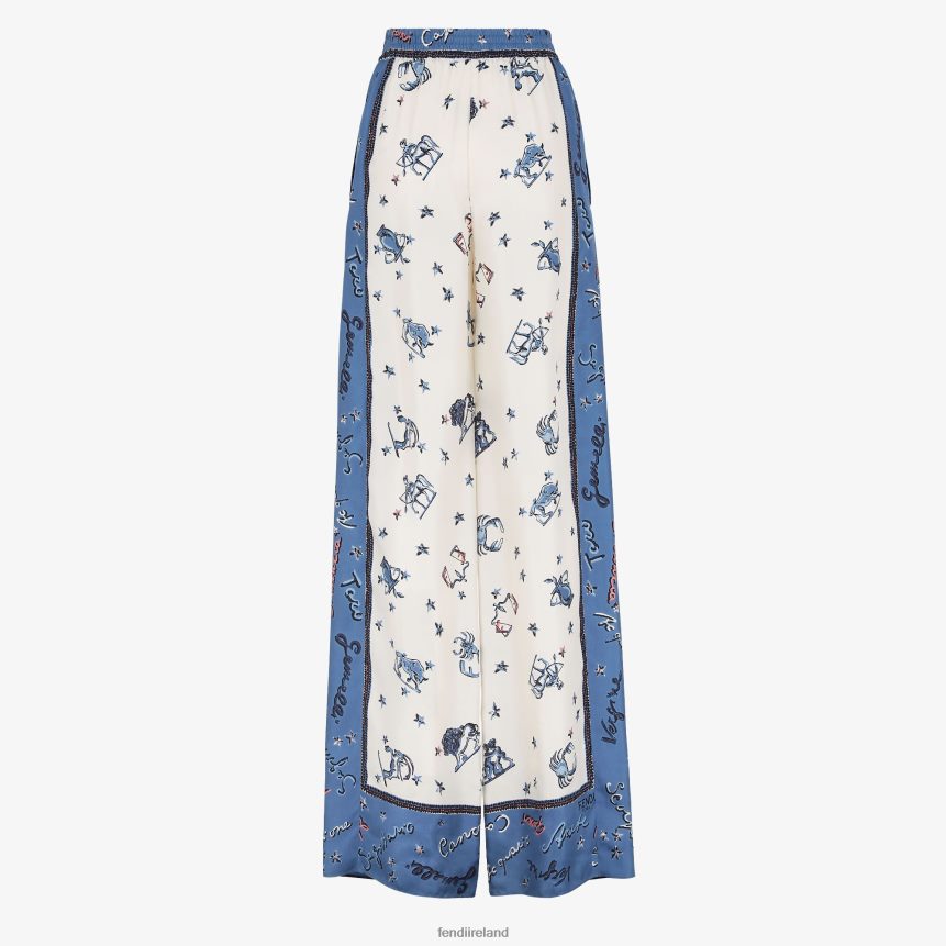 Flowing pajama trousers. Elastic waistband and side pockets. Made of silk twill in blue and white. Customized with an all-over Fendi Astrology motif print.