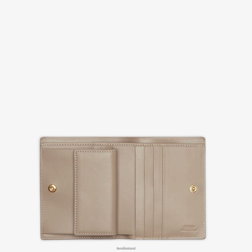 Compact F is Fendi bi-fold wallet Interior set out with flat pocket, coin purse with press-stud and four card slots. Made of beige cruise leather. Gold metalware.
