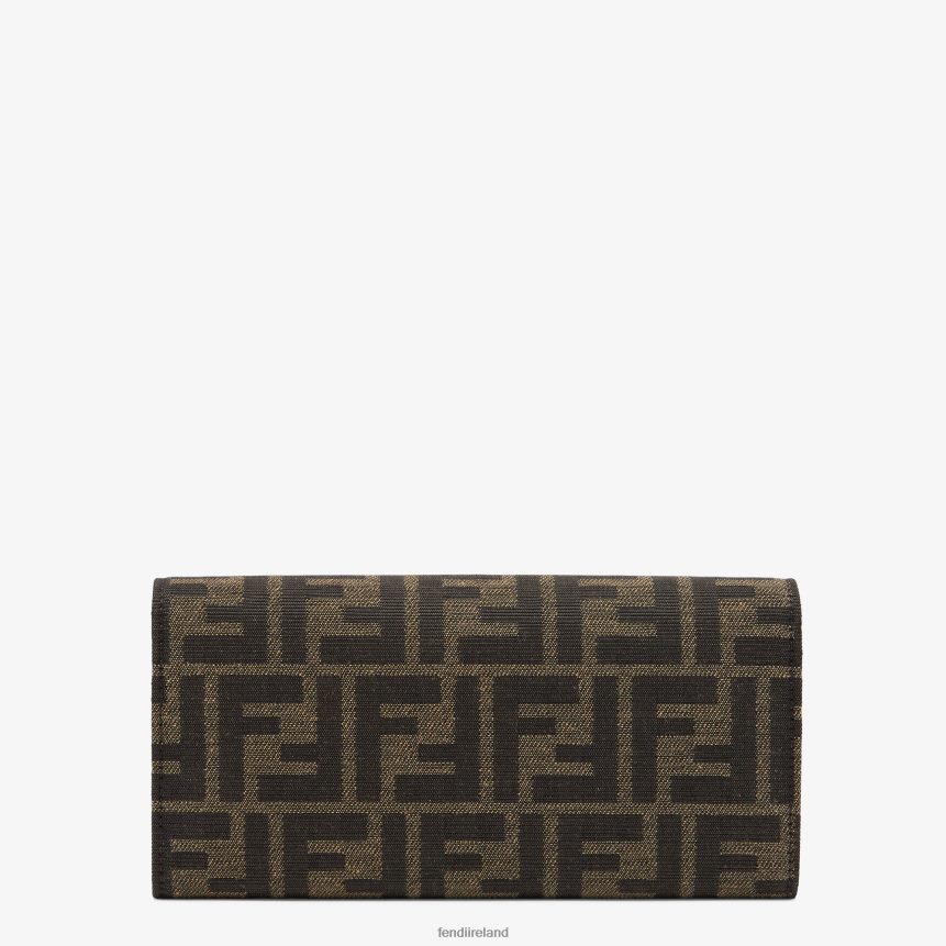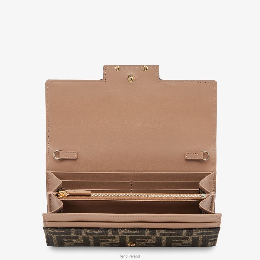 Baguette continental wallet with detachable, thin chain shoulder strap. The interior is laid out like a wallet with two gusseted compartments, a zip pocket, two flat pockets and ten card slots. Made of fabric with iconic brown jacquard FF motif. Dark brown leather lining. Gold-finish metalware.