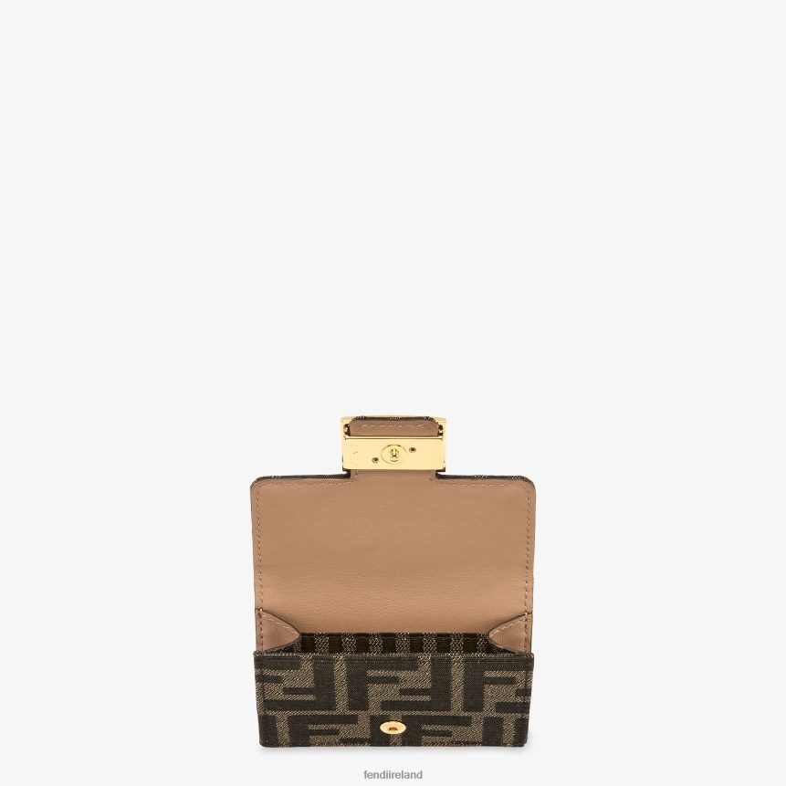 Compact, tri-fold Baguette wallet with large internal banknote compartment, three concealed card holders and an external coin purse with a press-stud fastening. Made of fabric with iconic brown jacquard FF motif. Dark brown leather lining. Gold-finish metalware.