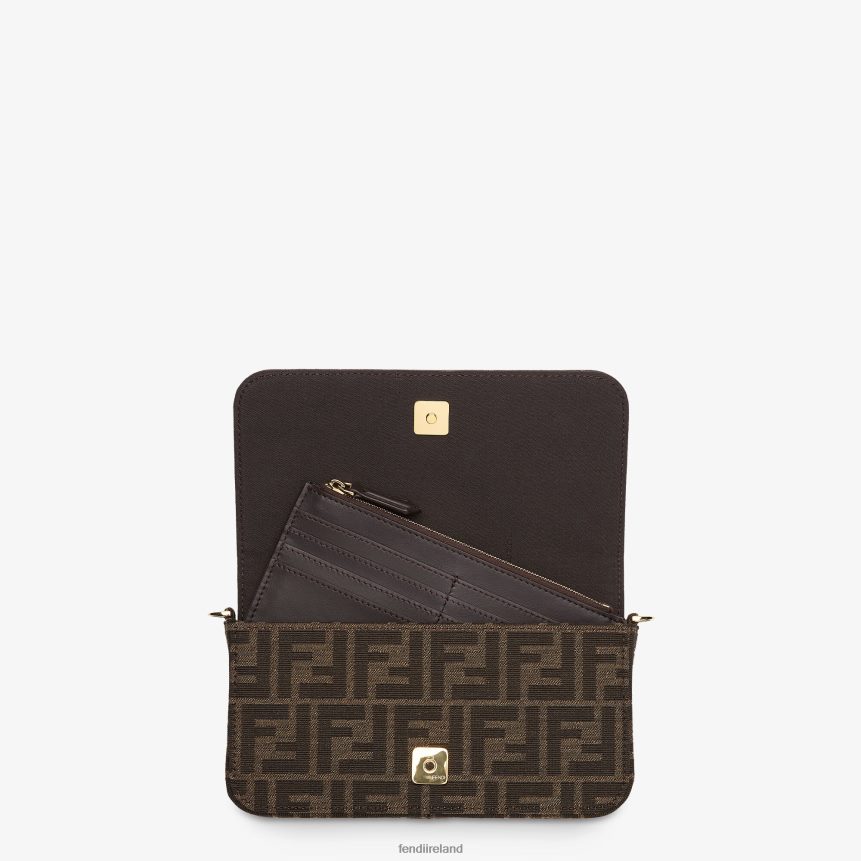 Compact Fendigraphy wallet with flap and metal Fendi lettering. Featuring an internal, removable pouch with eight card slots and zipper pocket. Thin, detachable chain shoulder strap. Made of brown FF jacquard fabric. Gold-finish metalware.