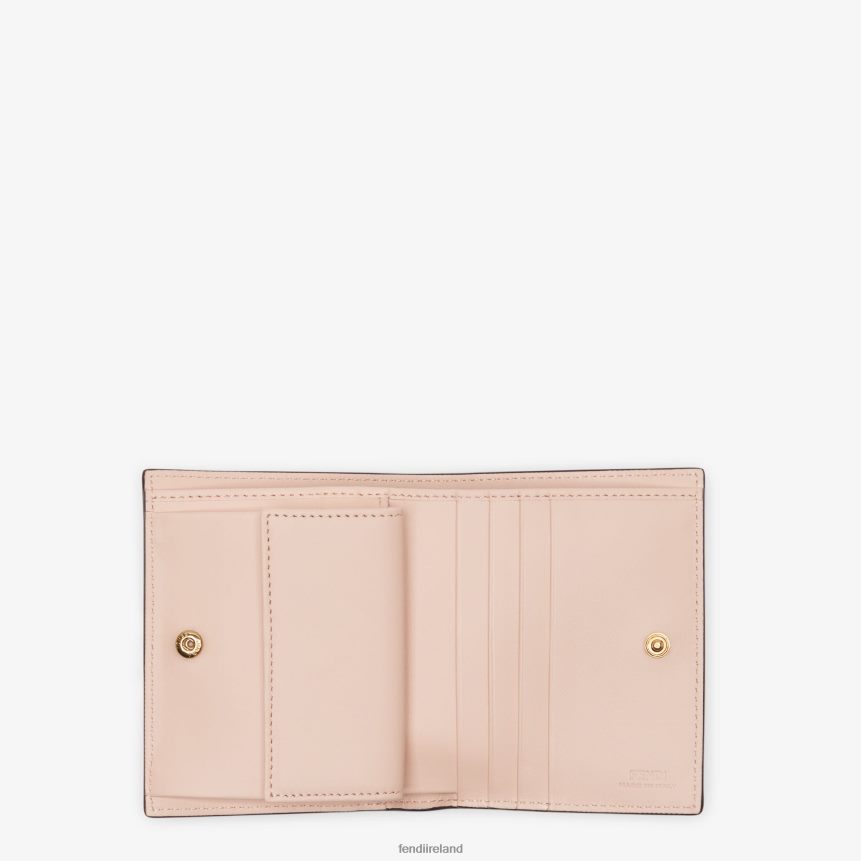 F is Fendi compact bi-fold wallet. Interior organized with a flat pocket, a coin pocket with press stud and four card slots. Made of light pink tumbled Cruise leather. Gold-finish metalware.