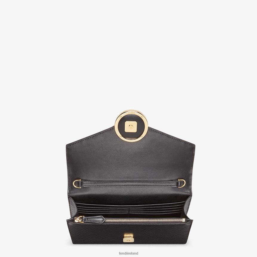 Mini bag with geometric flap decorated with the Fendi logo. Press-stud fastening. Gusseted sides and interior set out like a wallet, with eight card slots, flat pocket and zipped pocket. Detachable chain shoulder strap. Made of black tumbled Cruise leather. Finished with embossed and hand-painted FF motif. Palladium-finish metalware.