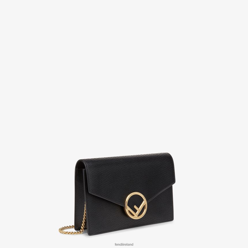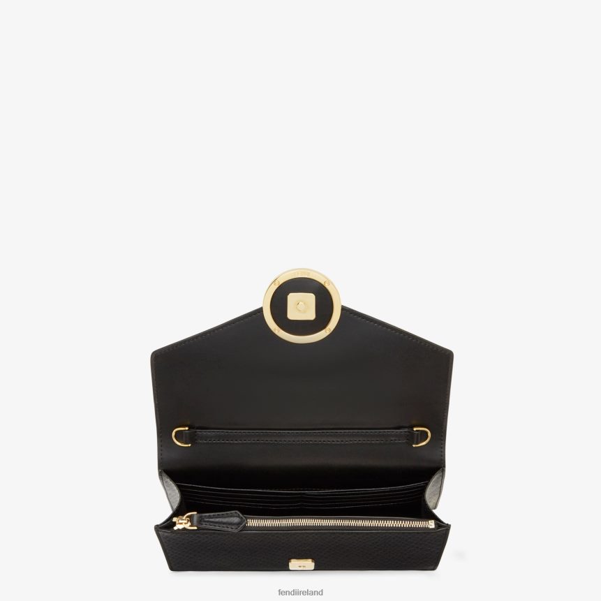 F is Fendi mini-bag with geometric flap decorated with the Fendi logo. Press-stud fastening. Gusseted sides and interior set out like a wallet, with eight card slots, flat pocket and zipped pocket. Detachable chain shoulder strap. Made of black calfskin. Gold-finish metalware.